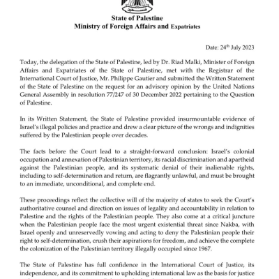 In its Written Statement, the State of Palestine provided insurmountable evidence of Israel’s illegal policies and practice and drew a clear picture of the wrongs and indignities suffered by the Palestinian people over decades.