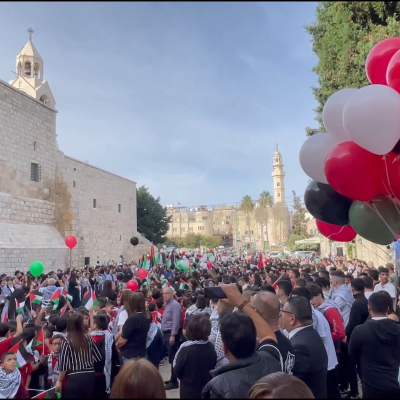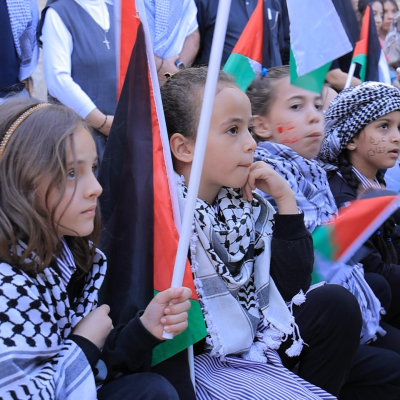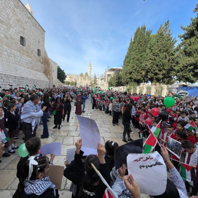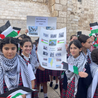 "The children gathered in the Nativity Square, raising Palestinian flags and images of the martyred children in Gaza, urging the world from the holiest place in Christian heritage to pressurize Israel to stop its crimes and pave the way for holding Israeli war criminals accountable."