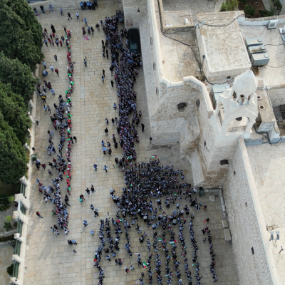 Standing in front of the Church of the Nativity, the voice of Bethlehem's children raises a cry on behalf of Palestinian children, both in general and especially in Gaza, to the entire world, demanding an end to the ongoing massacre against our people."