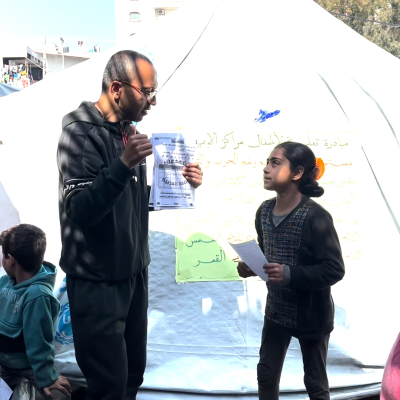 According to Mr. Al-Khudari, the initiative began by teaching students' poetry, prose, and poems as an attempt to simulate the educational environment in terms of speech, delivery, and oratory. All that they learned in the educational environment was applied in the classroom setting, particularly in the makeshift schools for displaced students.