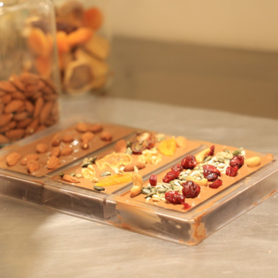Shehab explains the method of making chocolate with the flavor of mountain sage and honey. She says that initially, they prepare the chocolate mixture, which they blend in a special machine in the factory and pour it into a mold. Then, they wait for the chocolate to cool to a certain temperature. After that, they add the filling, which is the flavor of mountain sage and honey, inside the chocolate in the form of a bonbon. They add more chocolate to cover it, then put it in the refrigerator again for a few minutes. Afterward, they remove it, pack it in special boxes, wrap it, and deliver it.