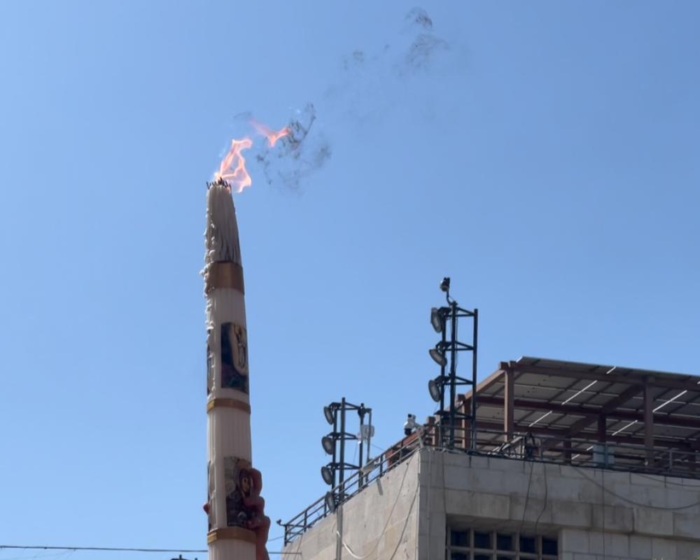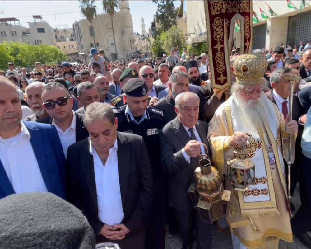Hundreds of Palestinian Christians gathered in Manger Square for the arrival of the Holy Fire, a sacred Easter tradition. Church leaders had previously decided to cancel celebratory aspects of the event in light of the war. The Greek Orthodox Patriarchate’s representative, Bishop Benediktos, welcomed the fire from Jerusalem alongside other clergy, Bethlehem Governor Mohammad Taha Abu Alia, Mayor Anton Salman, local officials, and members of the Palestinian security forces.