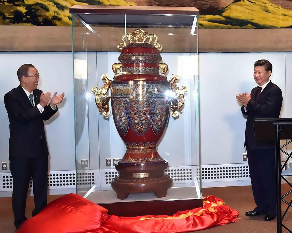 In the stately Conference Building at the United Nations Headquarters in New York City, a 65-inch-tall resplendent bronze vessel gleams under soft light, its cloisonne enamel blazing in vibrant Chinese red.