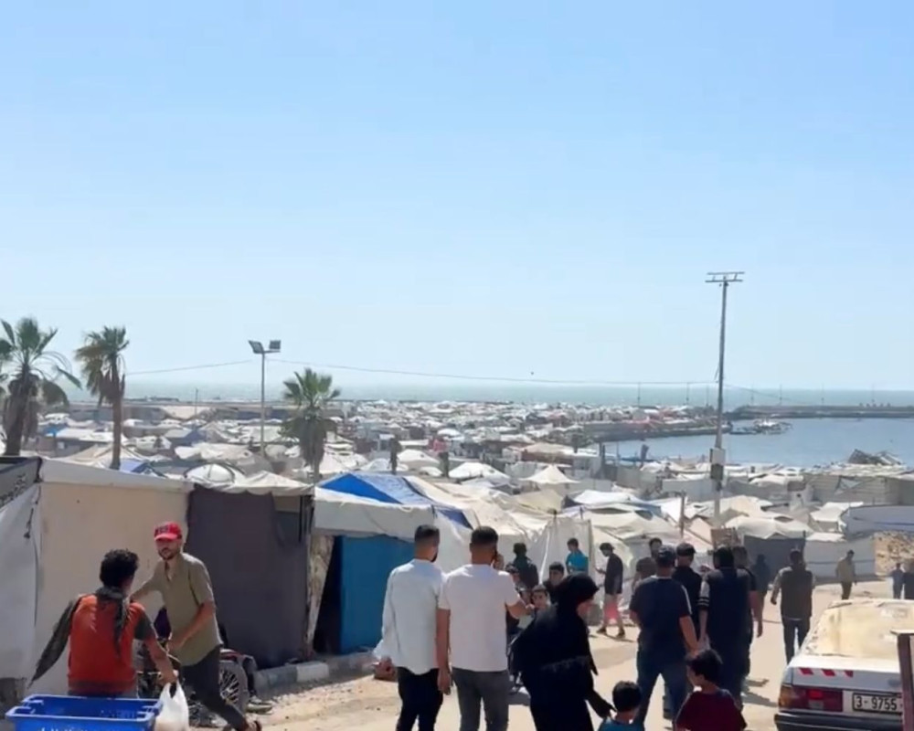 Displaced mother Shireen Abu Tabl, surrounded by her children, looks out from a tent at the fishermen’s port, hoping her children can live safely, free from the fear of gunfire, shells, and Israeli boats firing at the displaced. She and her family fled under the fire of quadcopter drones from Jabalia Camp and found no safer place than the seashore. Abu Al-Khair explains that the area remains unsafe; children are constantly frightened and terrified by the continuous fire from the occupation’s boats targeting both the displaced and the fishermen. She hopes to return home and for life to resume as it once was, so her children can enjoy a better future and a safer life.