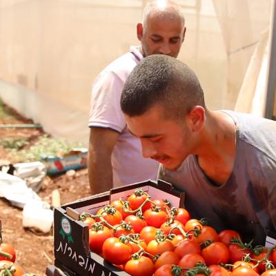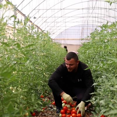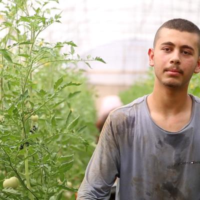 Hafez Abu Jeash, a young man, explains that he has been working with his father in vegetable farming for about four months. He says, "I pick tomatoes and pack them in cartons." He adds that the work in the greenhouse began on March 15th of last year, and he hopes to master his skills and become a creative farmer.