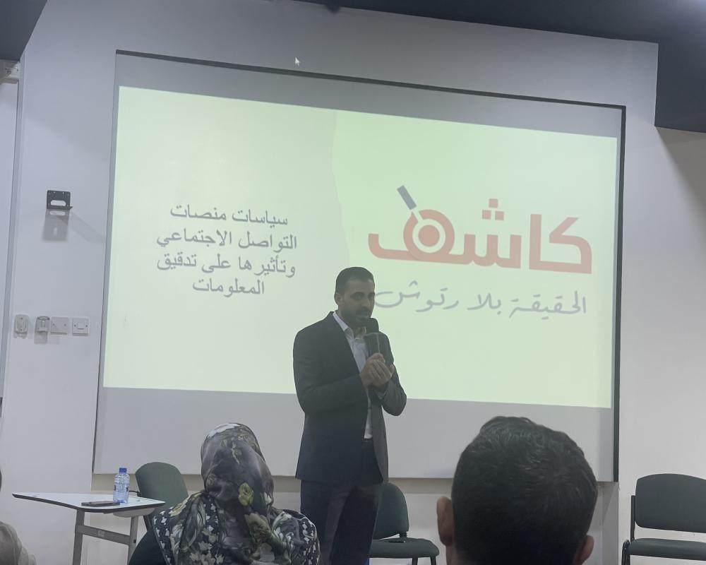 The first day concluded with a workshop on fact-checking tools and platforms, led by Kayed Mi’ari, co-founder of the Palestinian fact-checking and media literacy observatory Kashif. Mi’ari discussed the impact of fact-checking on independent media in the region, highlighting how verifying information has helped mitigate social crises on multiple occasions.
