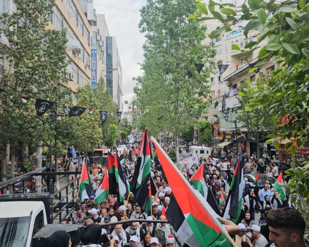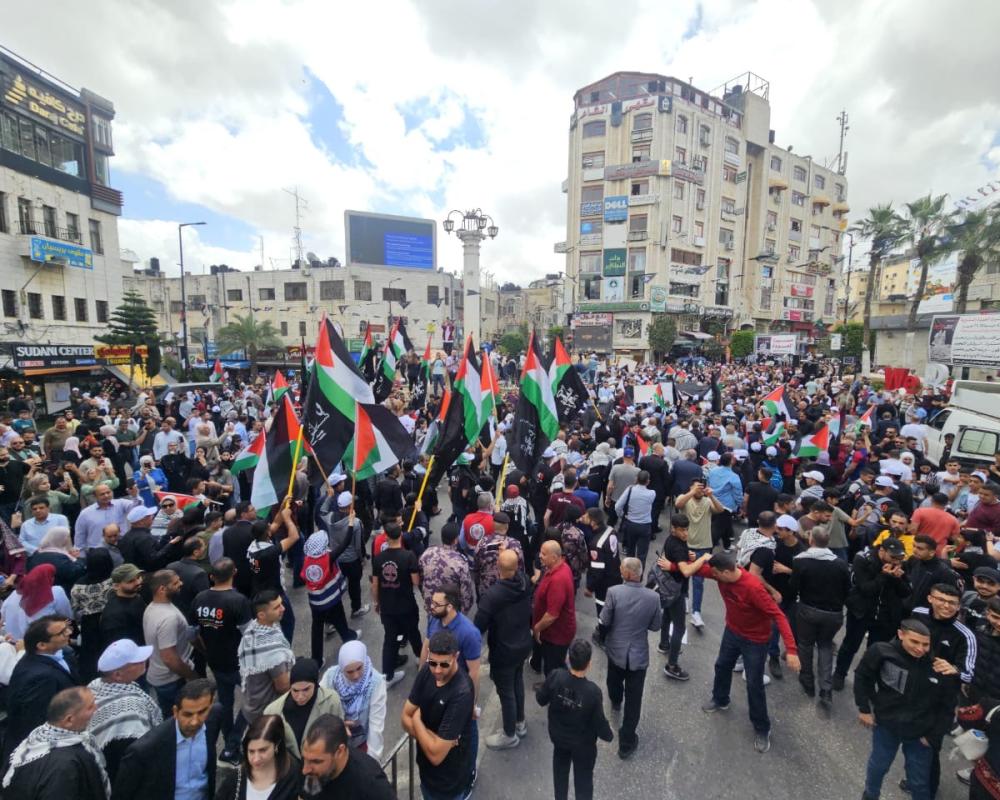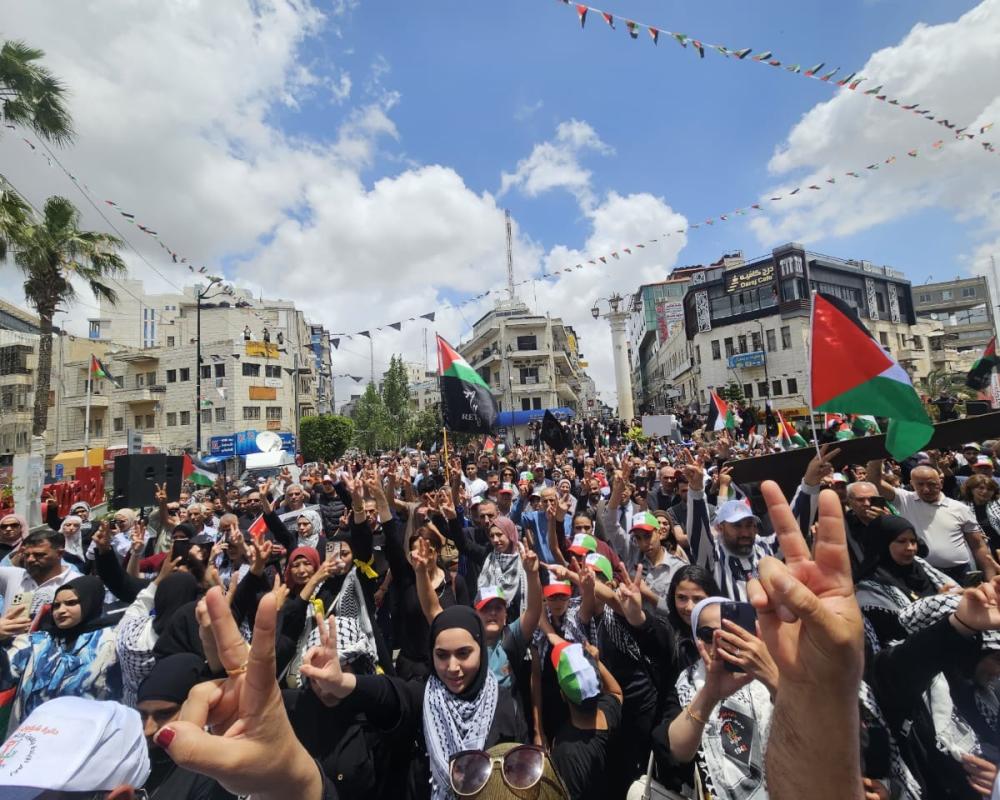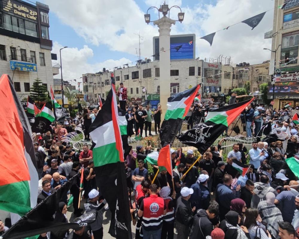 Thousands participated in a central rally, which began at the tomb of the late President Yasser Arafat and proceeded to Al-Manara Square. Participants waved Palestinian flags, raised black banners, and carried symbolic keys of return.