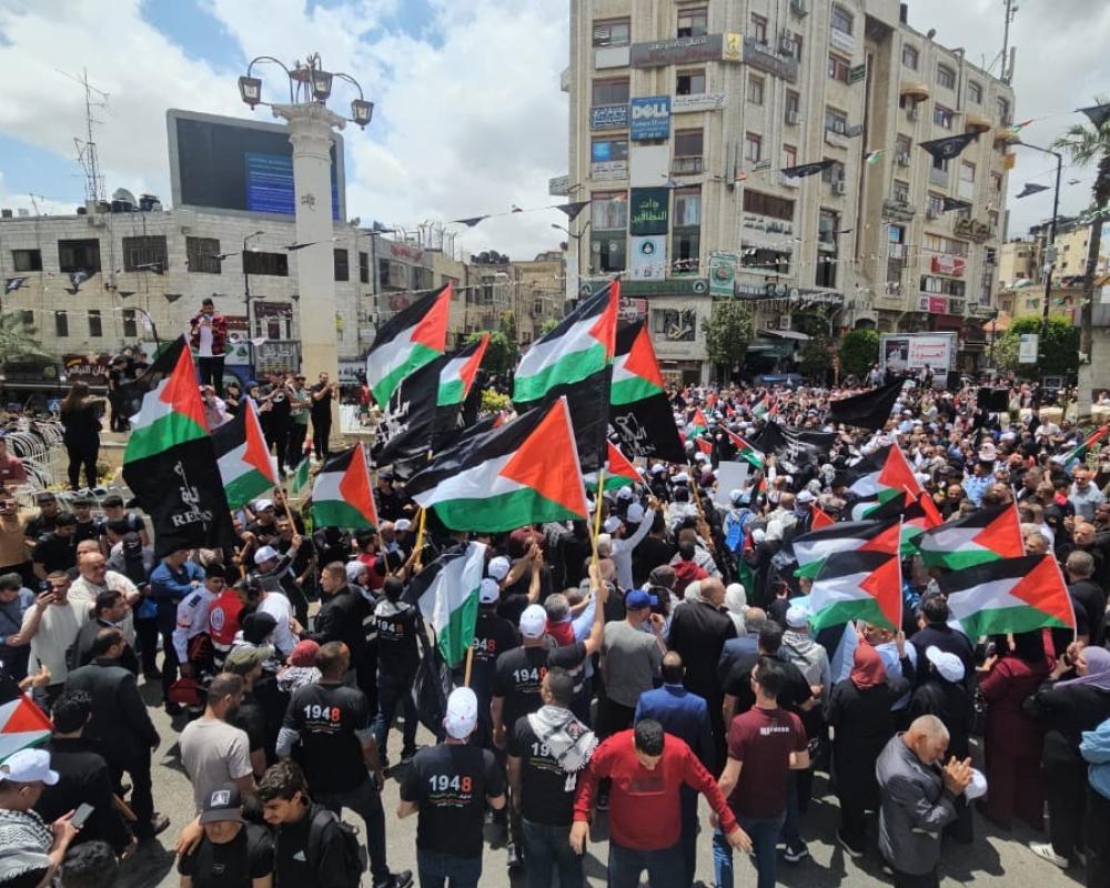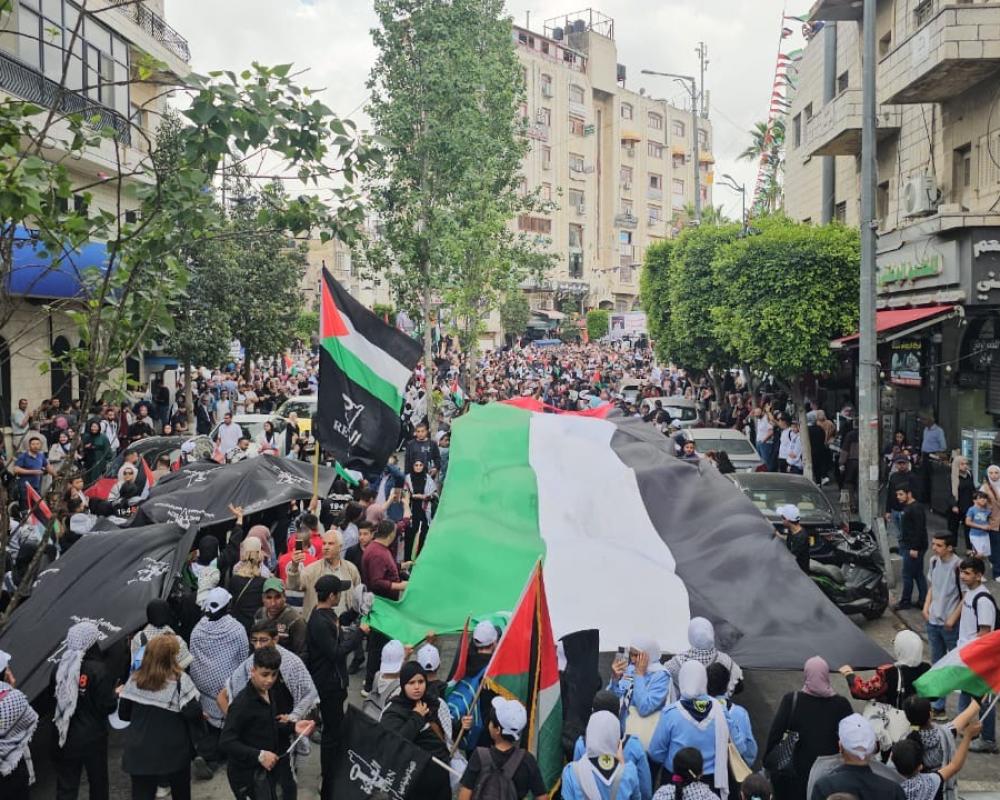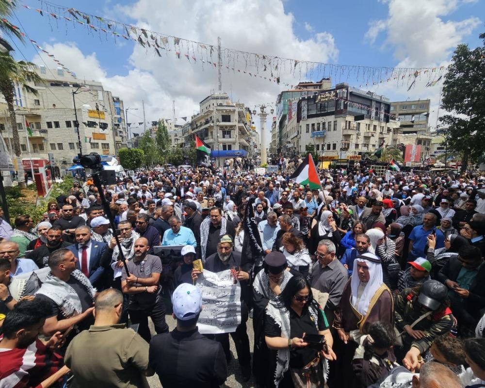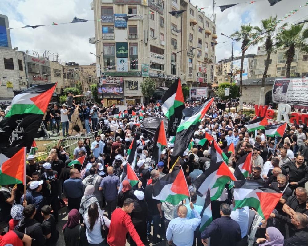 Thousands participated in a central rally, which began at the tomb of the late President Yasser Arafat and proceeded to Al-Manara Square. Participants waved Palestinian flags, raised black banners, and carried symbolic keys of return.