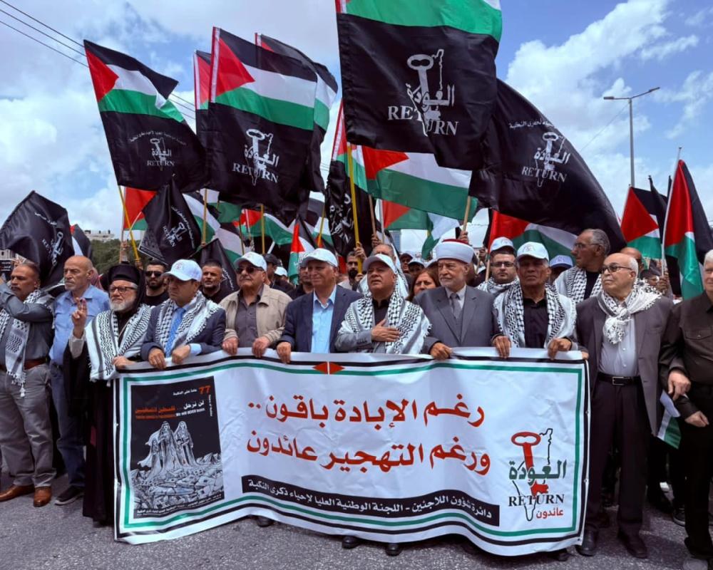 The march was organised by the PLO’s Department of Refugee Affairs and the Higher National Committee for Nakba Commemoration. It was attended by members of the PLO Executive Committee and Fatah Central Committee, members of the Revolutionary Council, national factions, ministers, and representatives of civil society.