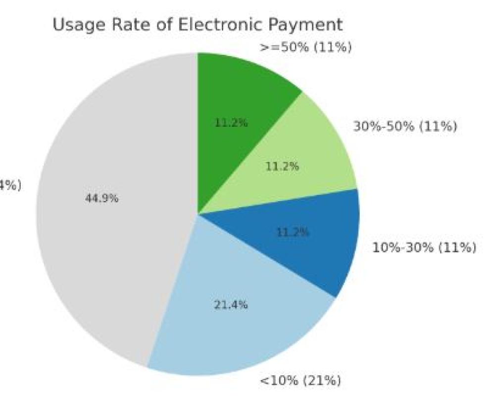 Despite the push toward electronic payments, 44% of respondents said they had not used them at all. About 21% reported using digital transactions for less than 10% of their operations, with higher usage rates limited to a minority of participants.