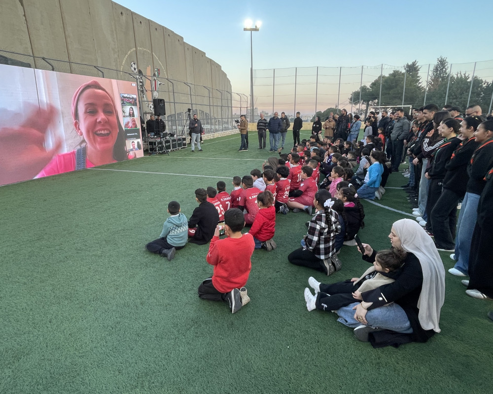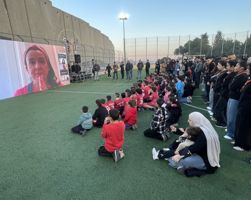 Children gathered in front of a large screen set up on the pitch, where Abu Srour introduced them to Taddler. She then delivered a message expressing solidarity with the children of Aida camp, rejecting the demolition decision and affirming her support for them.